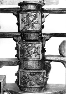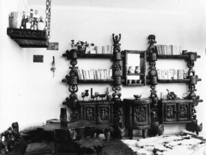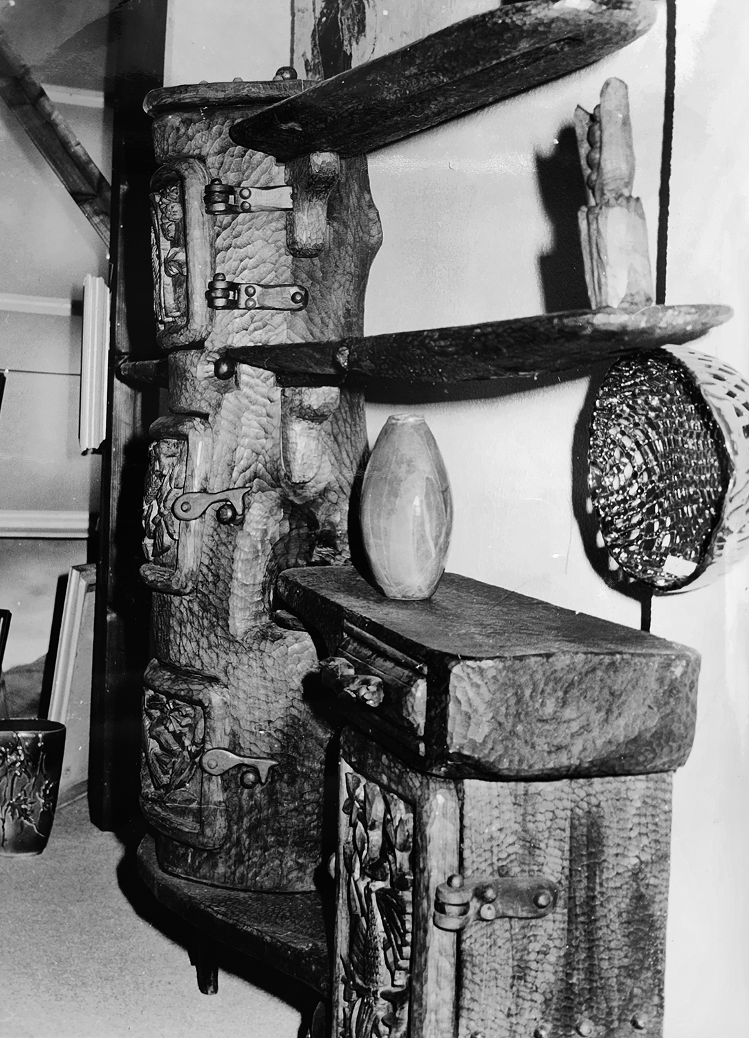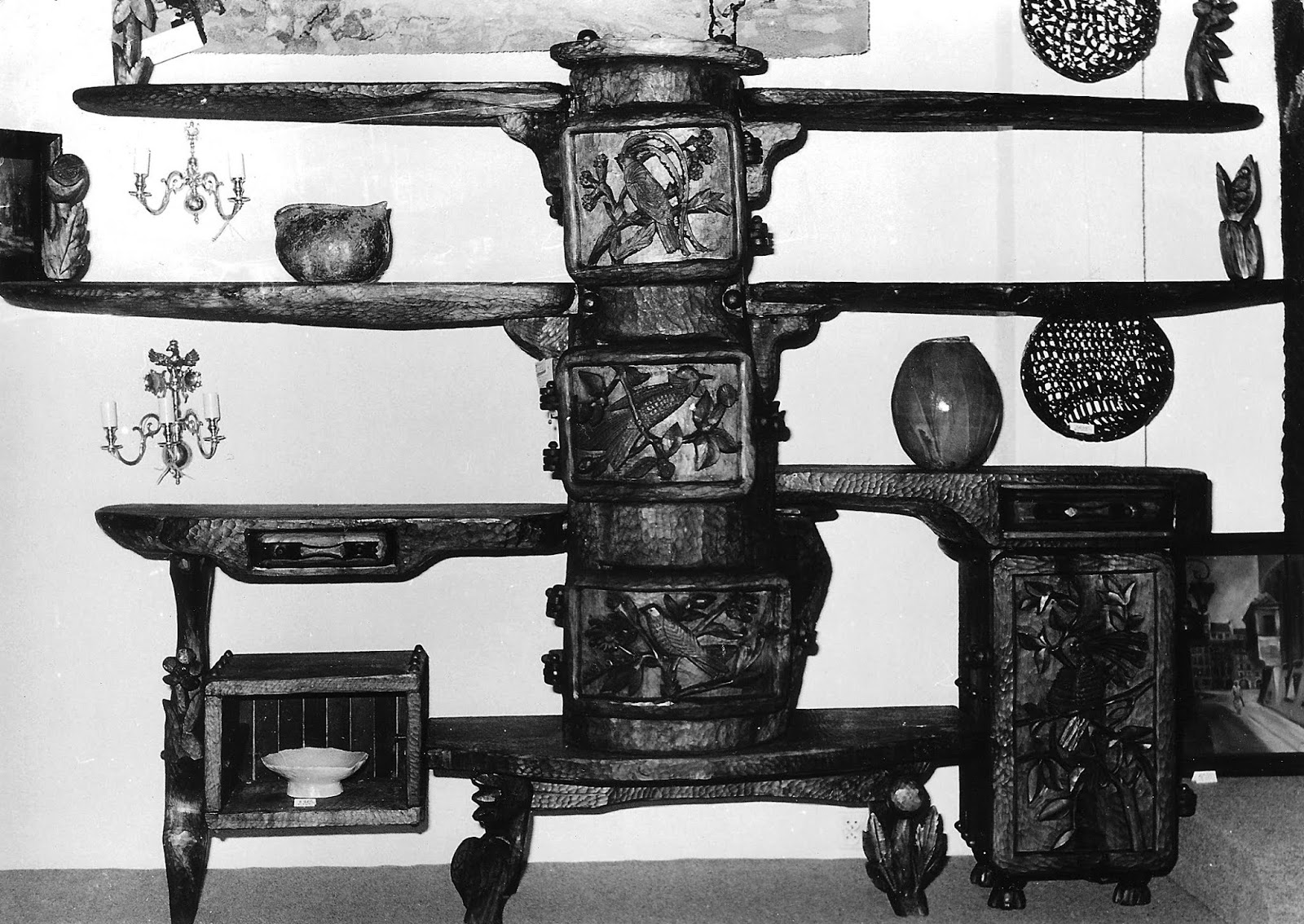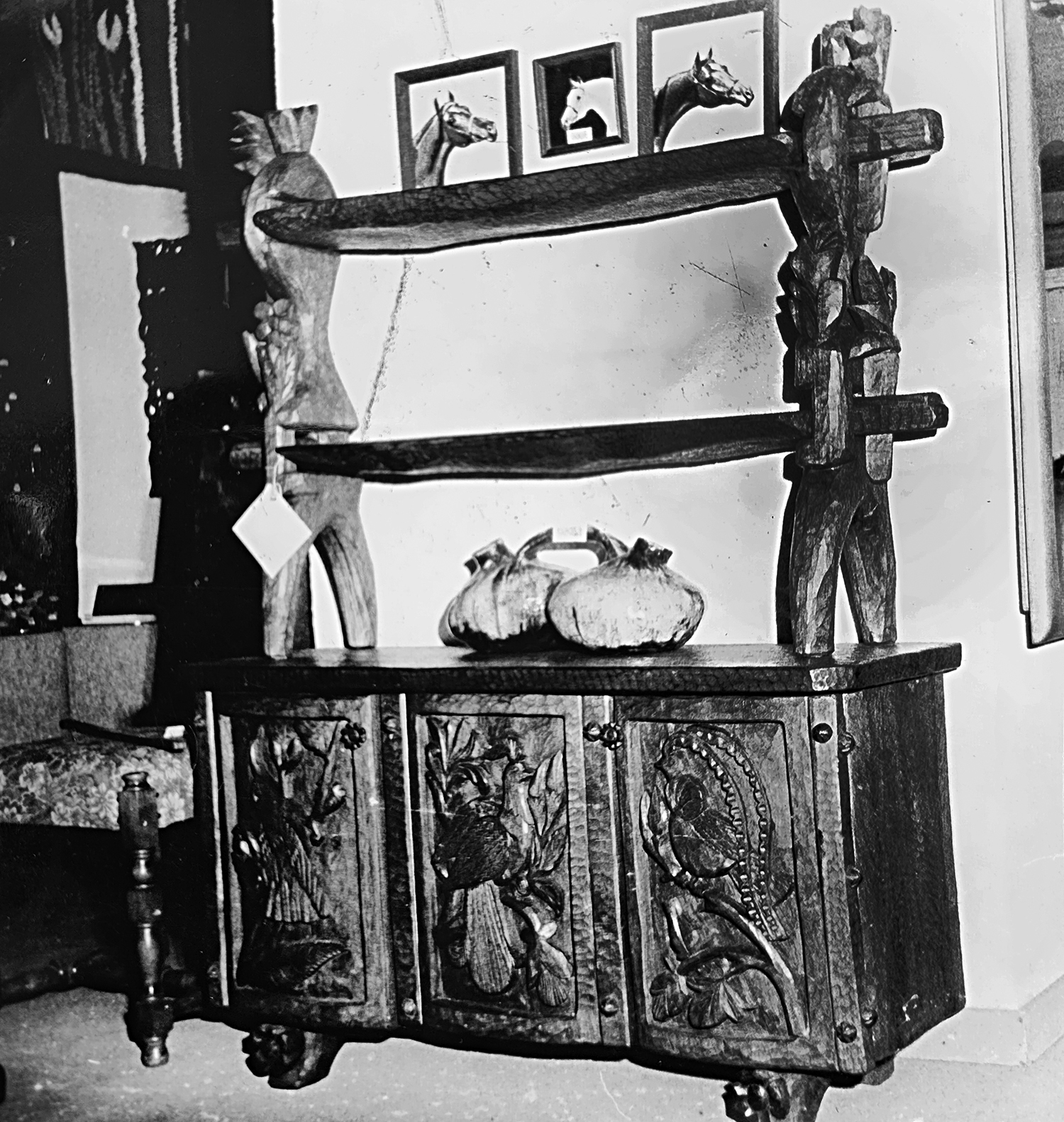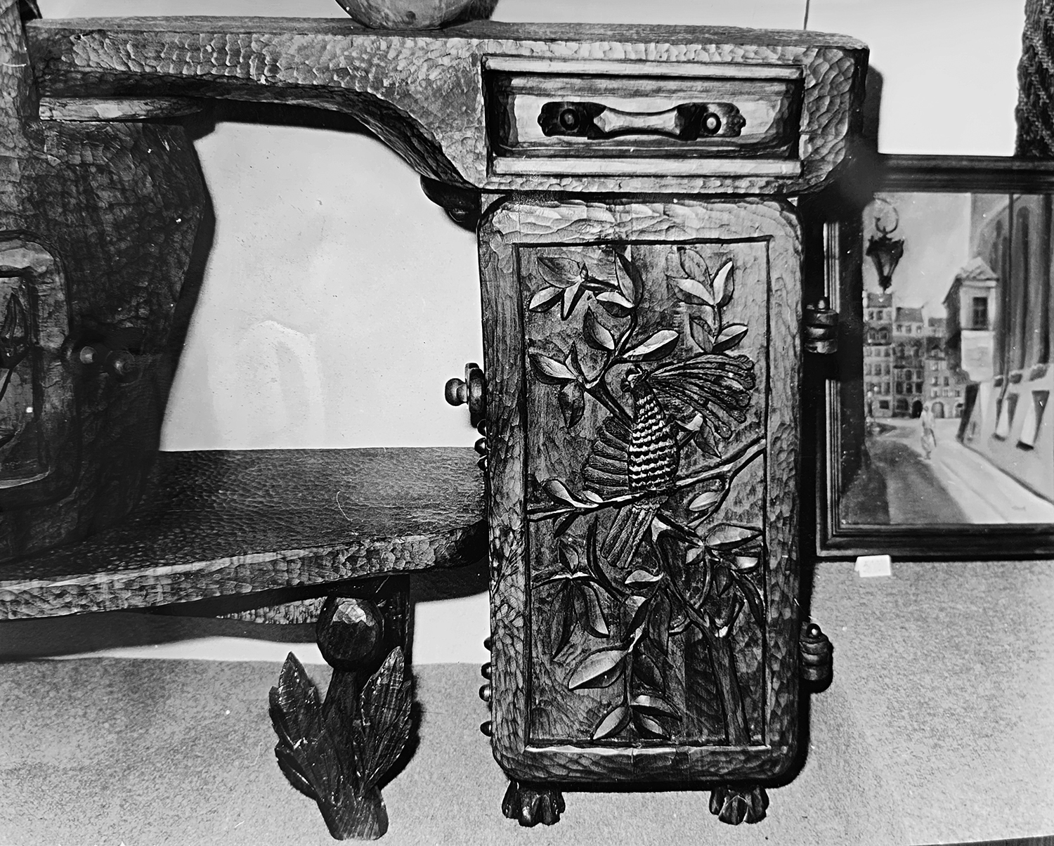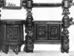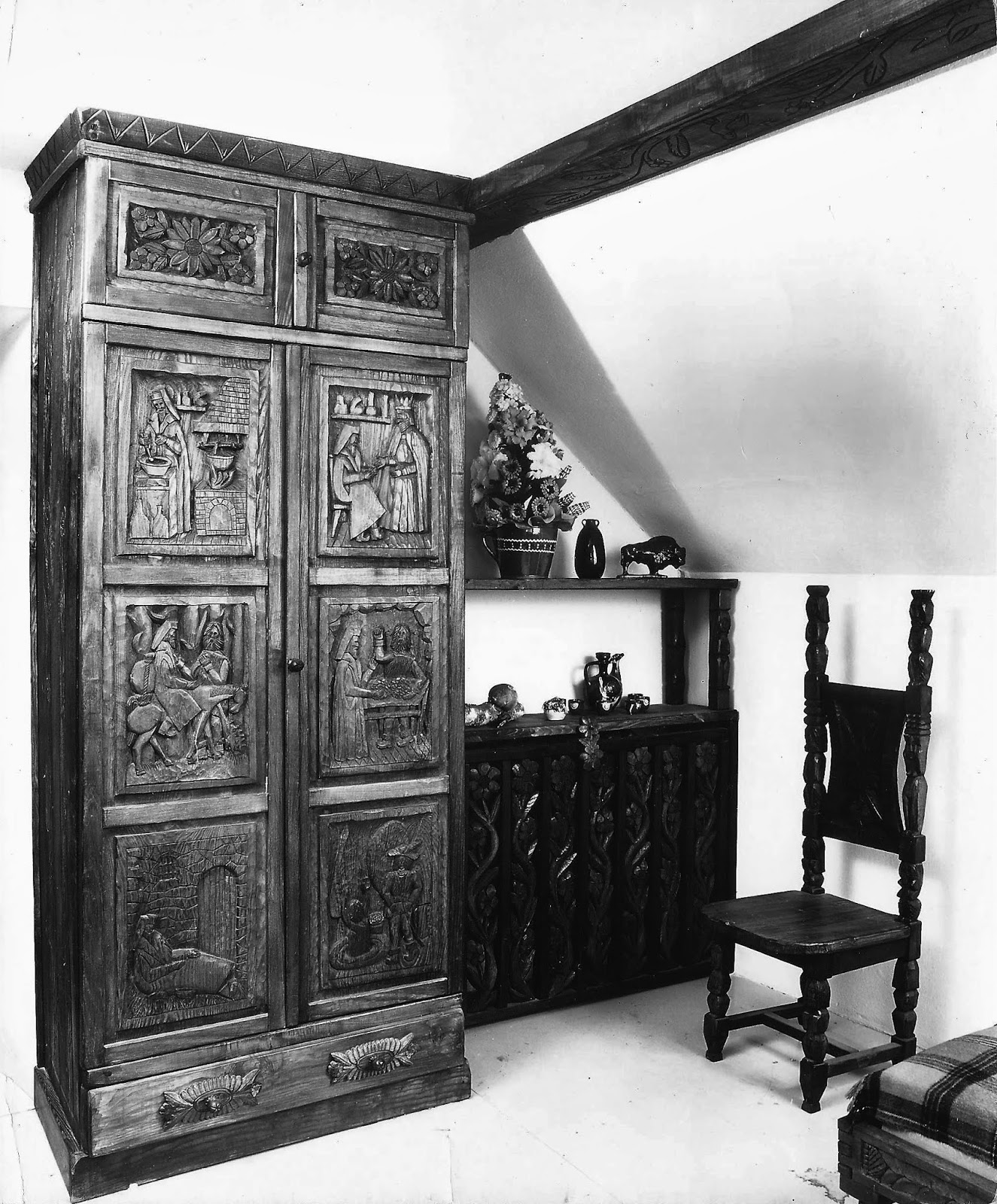 W dekoracyjnych panneau pojawiają się charakterystyczne motywy – ptaki, roślinność oraz sceny figuratywne – czerpiące z góralskiej symboliki, a zarazem osadzone w nowoczesnym, autorskim języku form. Masywne konstrukcje, rytmiczne tralki i wyraziste płaskorzeźby nadają meblom rzeźbiarski charakter, czyniąc je nie tylko użytkowymi przedmiotami, lecz także pełnoprawnymi dziełami sztuki.